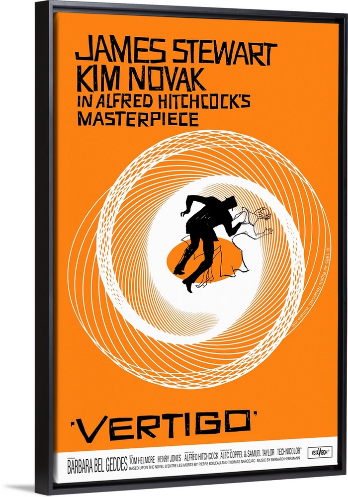 <p>Movie poster for Alfred Hitchcock's hit film Vertigo. It shows the drawing of two silhouettes falling down a spiral.</p>