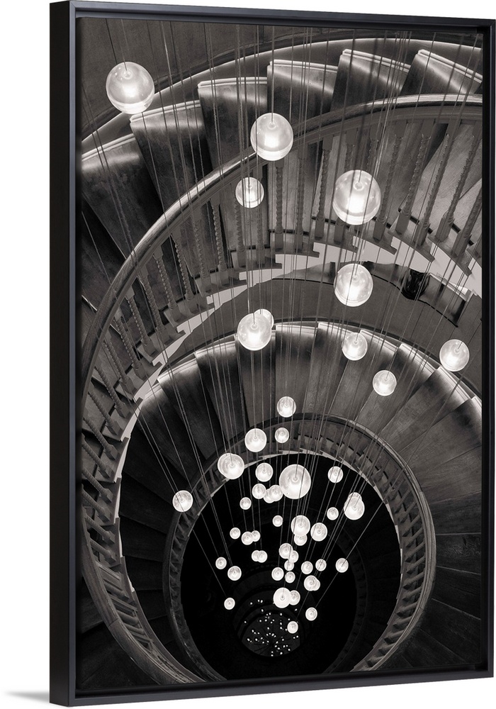 <p>Fine art photo looking down a spiral staircase, with round lights in the center, in black and white.</p>
