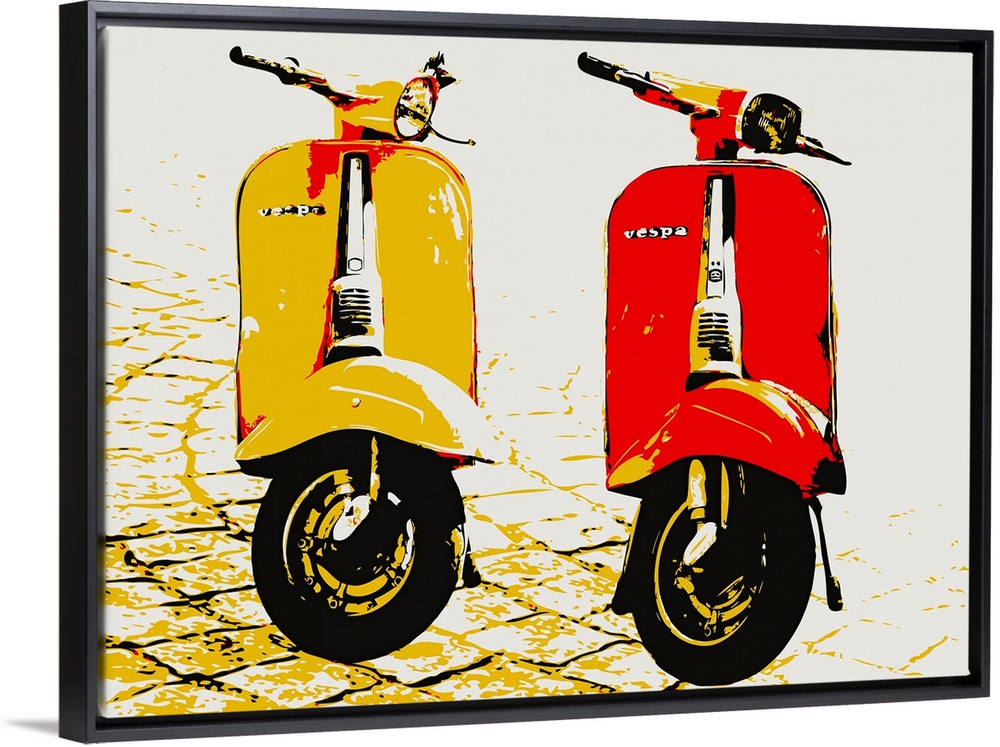 <p>Contemporary artwork of two mopeds on brick paved street.</p>