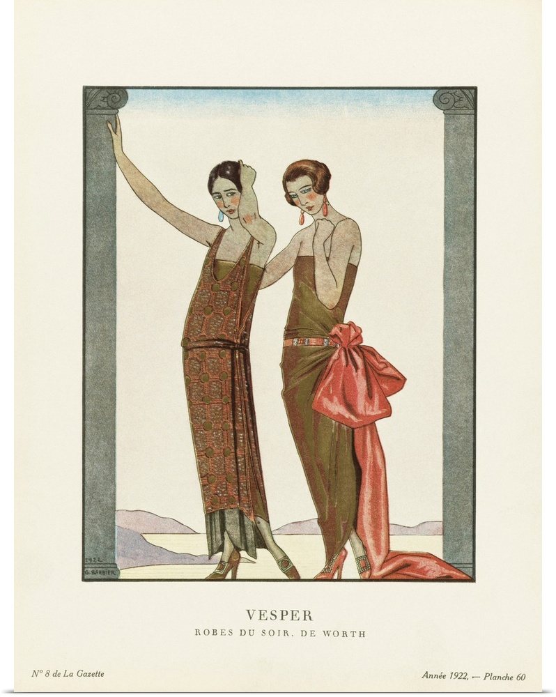 <p>Vesper. Evening. Robes du Soir, de Worth. Evening dresses by Worth. Art-deco fashion illustration by French artist George Barbier, 1882-1932. The work was created for the Gazette du Bon Ton, a Parisian fashion magazine published between 1912-1915 and 1919-1925.</p>