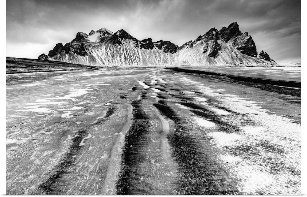 <p>Vestrahorn mountain in winter, from the black sand beach at Stokksnes covered in snow and ice, Southeast Iceland.</p>