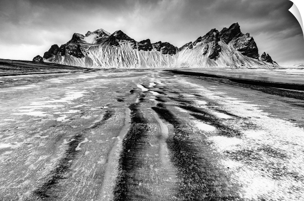 <p>Vestrahorn mountain in winter, from the black sand beach at Stokksnes covered in snow and ice, Southeast Iceland.</p>