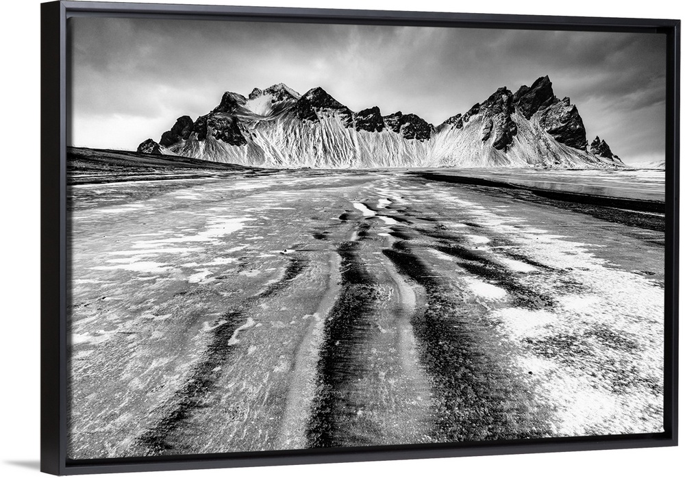 <p>Vestrahorn mountain in winter, from the black sand beach at Stokksnes covered in snow and ice, Southeast Iceland.</p>