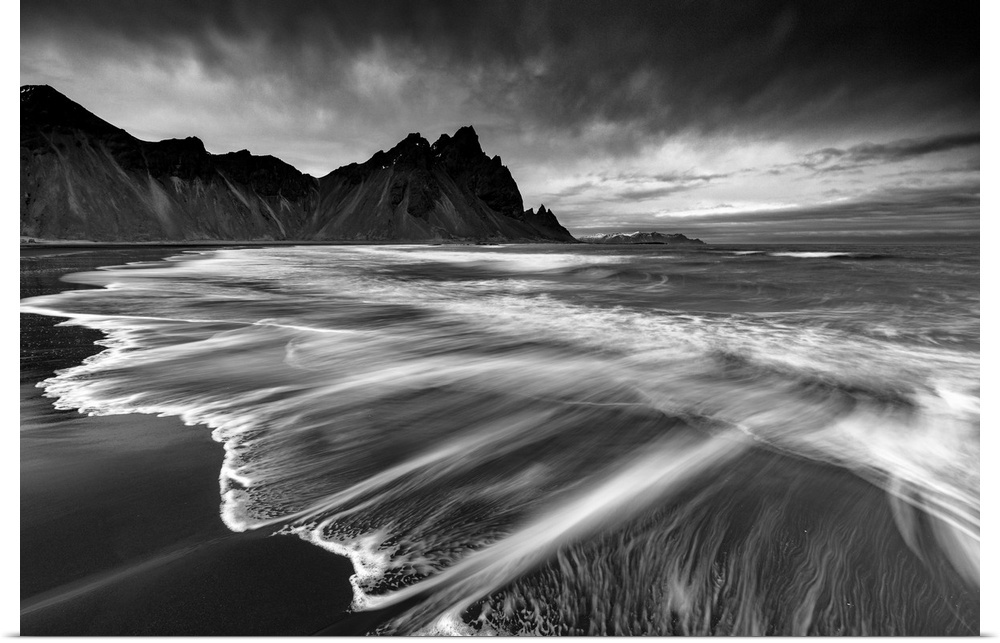 <p>Vestrahorn mountain in winter, with waves washing up the black sand beach. Stokksnes, Southeast Iceland.</p>