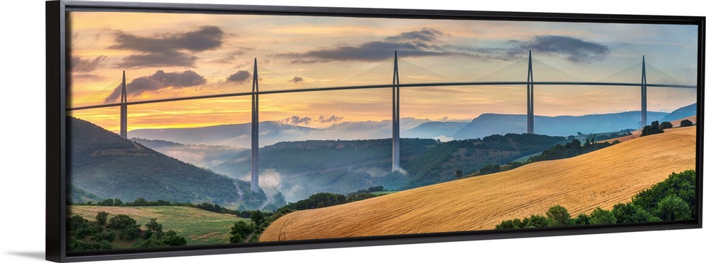 <p>Viaduc de Millau bridge over Tarn river valley at sunrise, Millau, Aveyron Department, Midi-Pyrenees, France.</p>