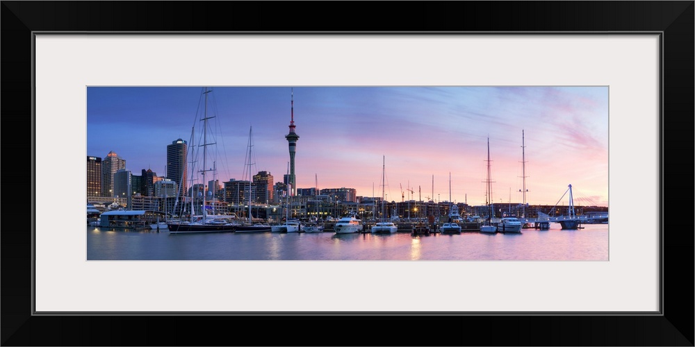 <p>Viaduct Harbour and Sky Tower at sunset, Auckland, North Island, New Zealand</p>