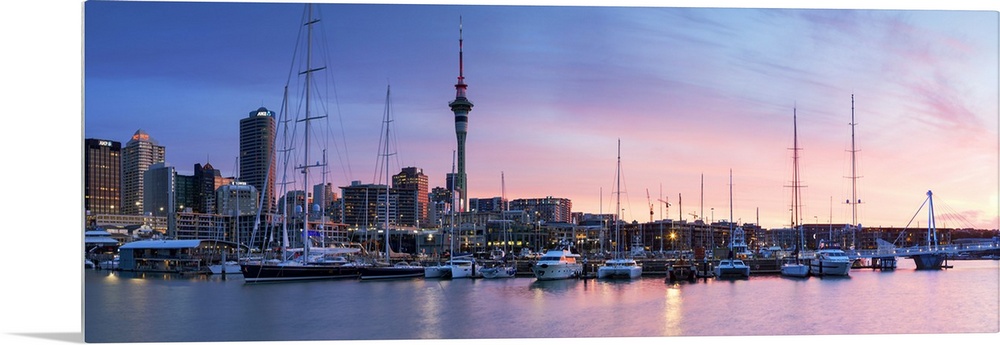 <p>Viaduct Harbour and Sky Tower at sunset, Auckland, North Island, New Zealand</p>
