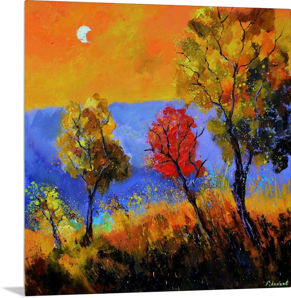 <p>Square painting with Autumn trees with a purple and orange background and a bright moon in the sky.</p>