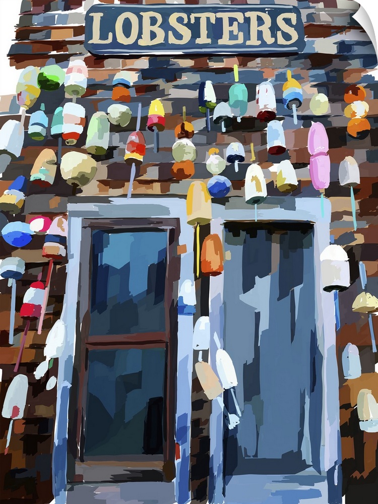<p>A colorful collection of lobster fishing buoys on the wall of a building.</p>