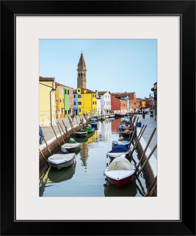 <p>Photograph of docked gondolas in a small canal in the Venetian Lagoon in Burano, Venice, Italy with the Leaning Bell Tower in the background.</p>