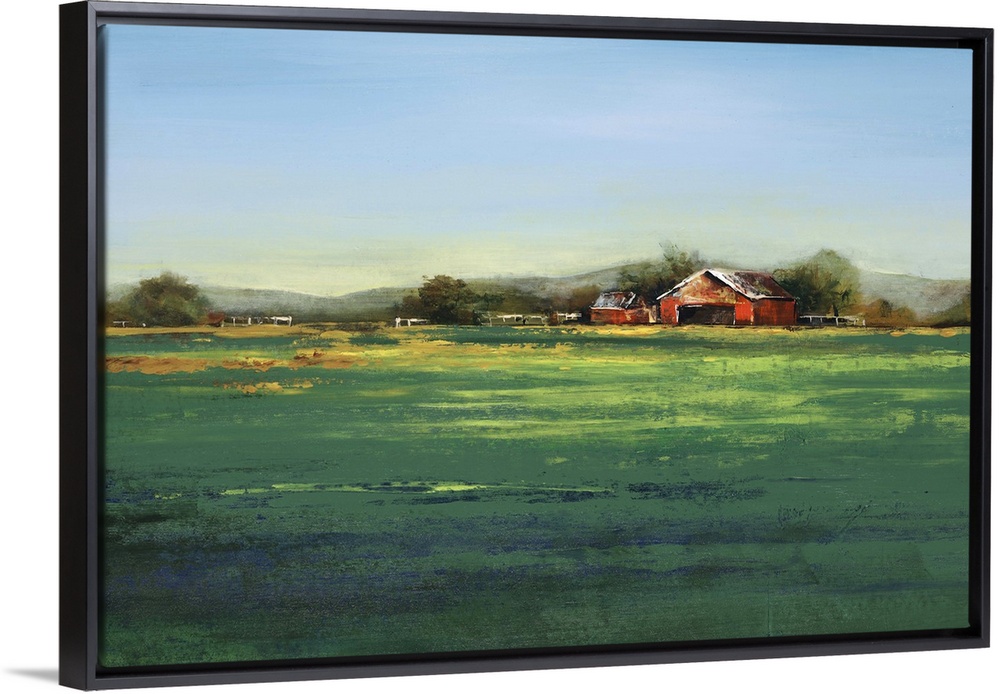 <p>Contemporary artwork of a farm landscape with a green field.</p>