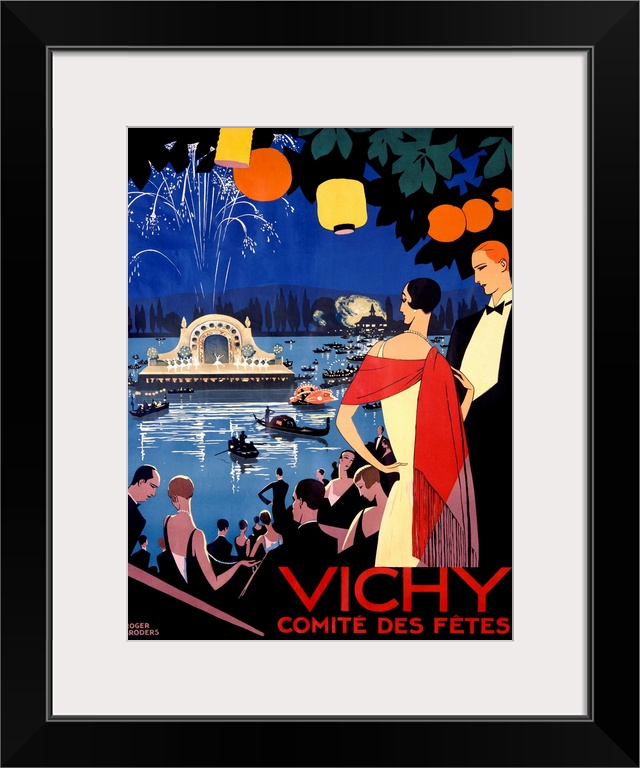 <p>Vertical, big vintage poster of an evening stage performance on water, with fireworks and surrounded by boats. A large crowd watches from land, where lanterns hang from the tree branches above. French text on the bottom of the image.</p>