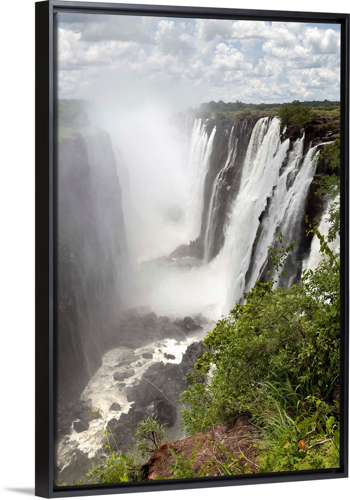 <p>Zambia side of Victoria Falls, (Mosi-oa-Tunya). Victoria Falls is a waterfall of 355ft (109m) on the Zambezi River on the border of Zambia and Zimbabwe in Southern Africa.</p>