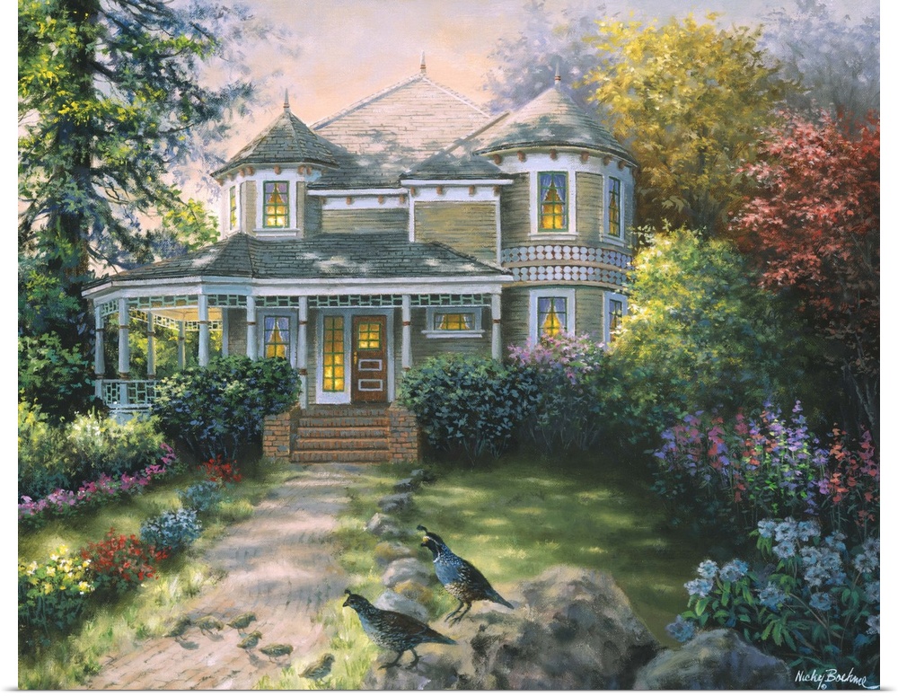 <p>Painting of a large Victorian house with glowing windows. Product is a painting reproduction only, and does not contain actual lights.</p>