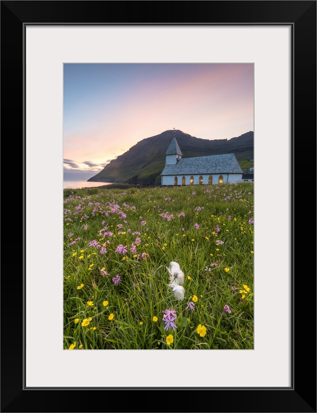 <p>Vidareidi village, Vidoy island, Faroe Islands, Denmark. Village's church at sunset.</p>