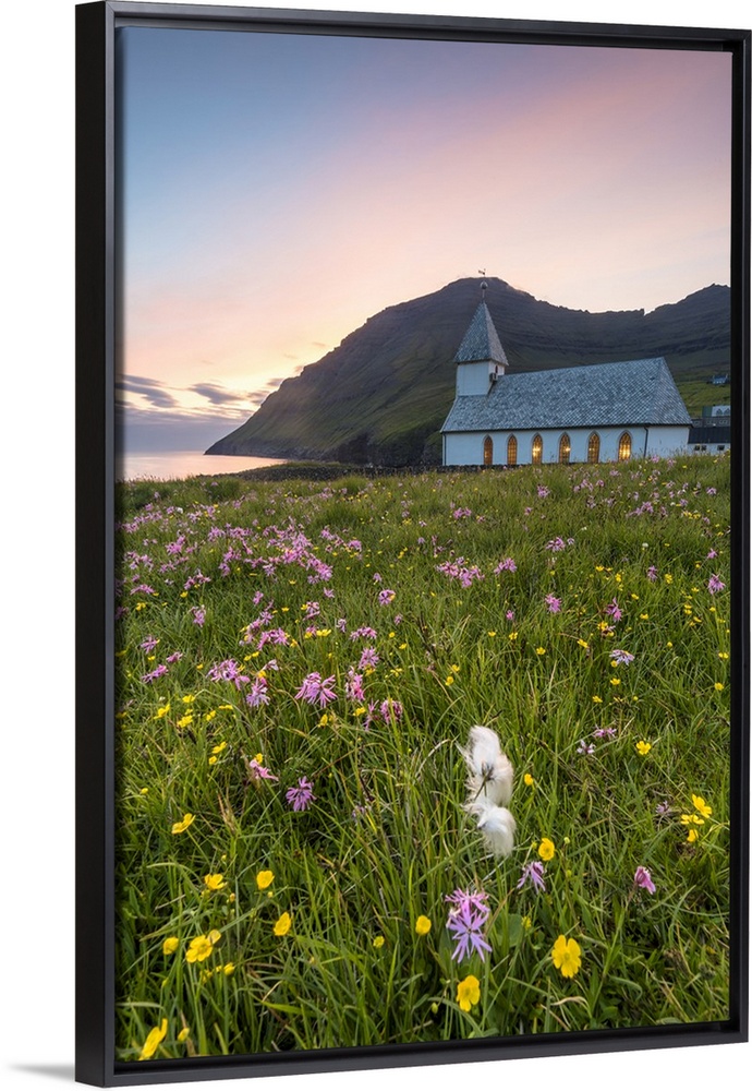 <p>Vidareidi village, Vidoy island, Faroe Islands, Denmark. Village's church at sunset.</p>