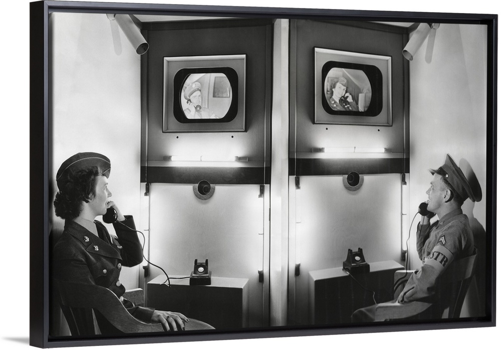 <p>Video telephone conversation between an Army Corporal in Centralia, Pa. and a WAC in Seattle, Wash. Both can see the other in a video-telephone exhibit of the Signal Corps. Displayed at Fort Monmouth, N.J., as part of Armed Forces Week program. c. 1950.</p>