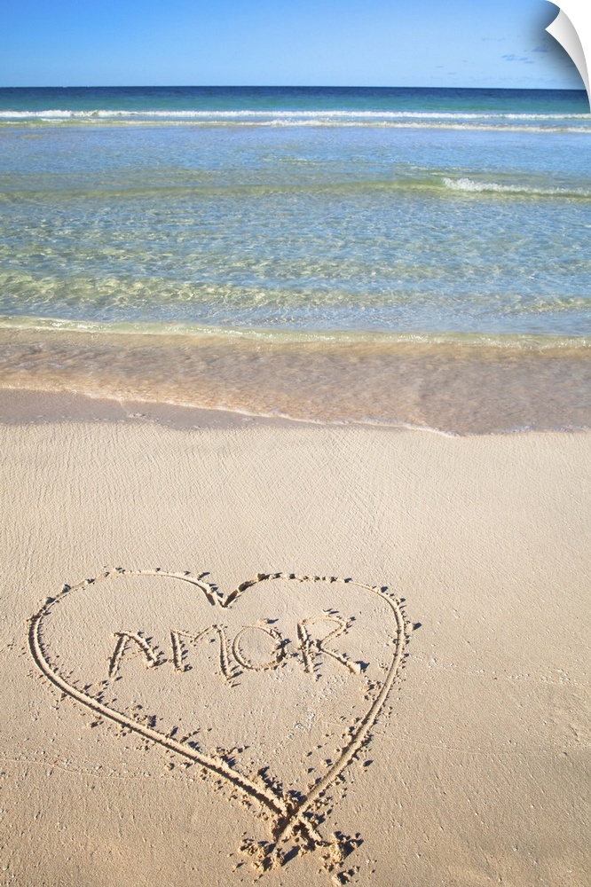 <p>Vieques, Puerto Rico - A heart is drawn in the sand of a beach with the word 'amor' inside. Vertical shot.</p>