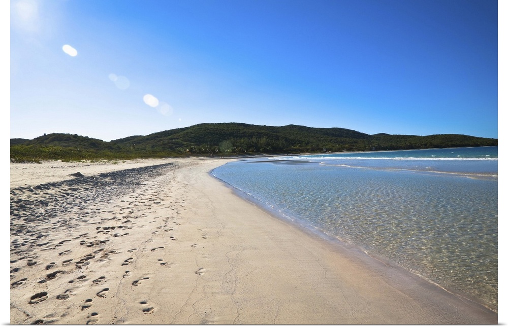 <p>Vieques, Puerto Rico - Gentle waves are rolling up onto the white sands of a tropical beach. Horizontal shot.</p>