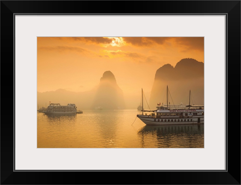 <p>Vietnam, Halong Bay, tourist boats, sunrise.</p>