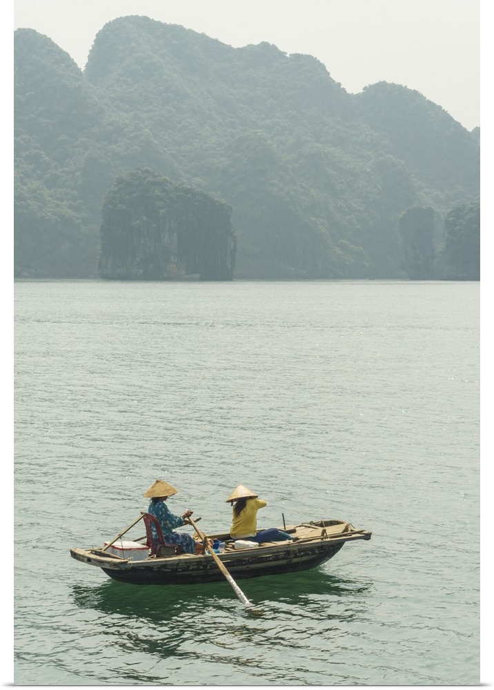 <p>Vietnam, Northeast, North Vietnam, Coast, Halong Bay, Women in a rowing boat with Cat Ba Island in the background.</p>