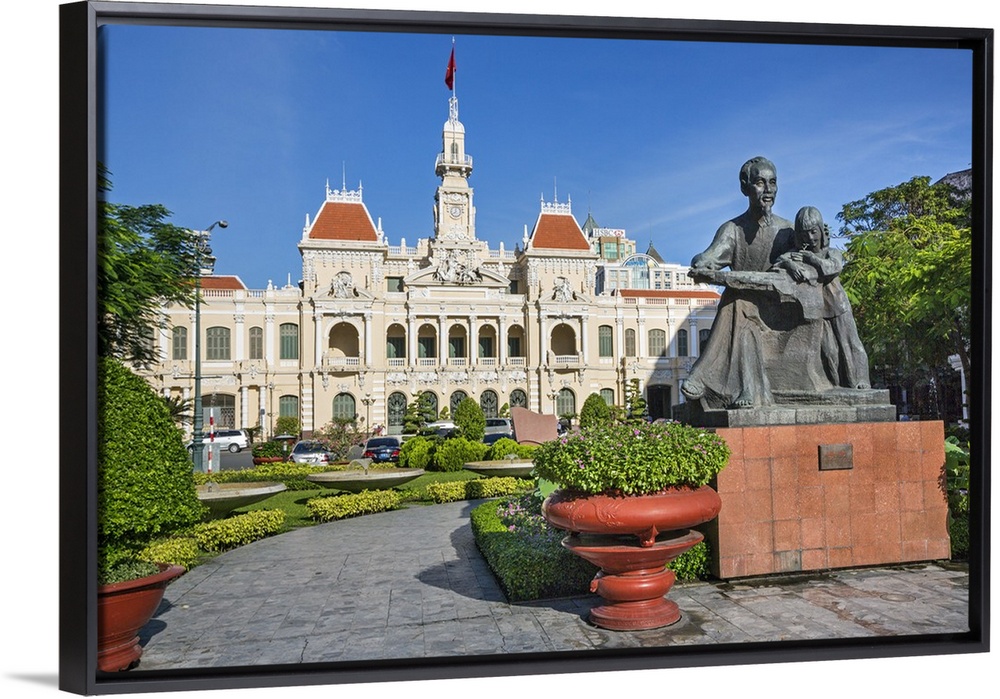 <p>Vietnam, Ho Chi Minh Province, Ho Chi Minh City, Saigon. Ho Chi Minh's statue in front of the imposing French colonial-style City Hall, now renamed the People's Committee Building, in the city centre.</p>