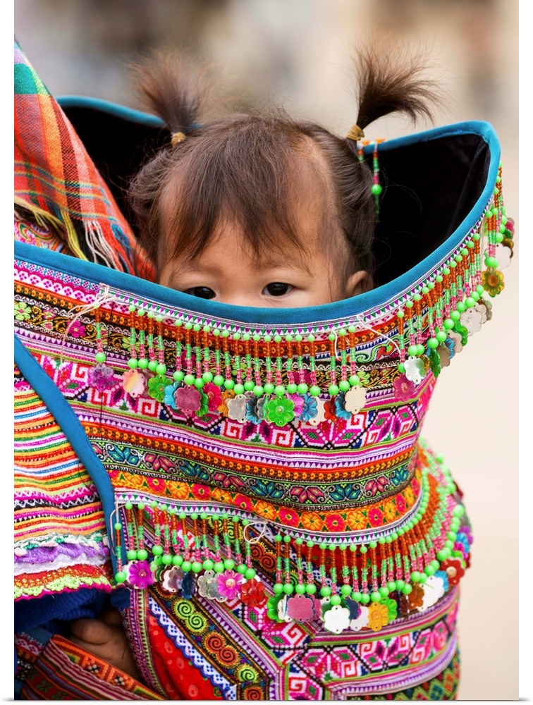 <p>Vietnam, Lao Cai Province, Bac Ha. A Flower H'mong baby girl peeps out from the comfort and security of a beautifully decorated baby carrier strapped to her mother's back.</p>