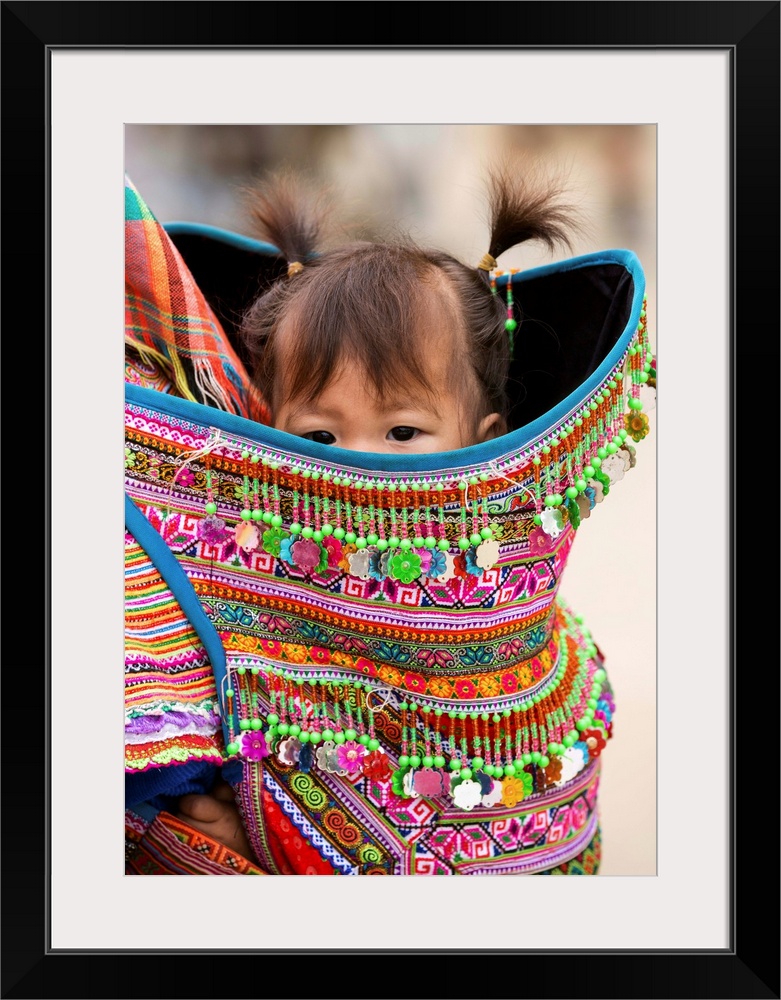 <p>Vietnam, Lao Cai Province, Bac Ha. A Flower H'mong baby girl peeps out from the comfort and security of a beautifully decorated baby carrier strapped to her mother's back.</p>