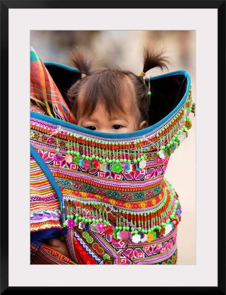<p>Vietnam, Lao Cai Province, Bac Ha. A Flower H'mong baby girl peeps out from the comfort and security of a beautifully decorated baby carrier strapped to her mother's back.</p>