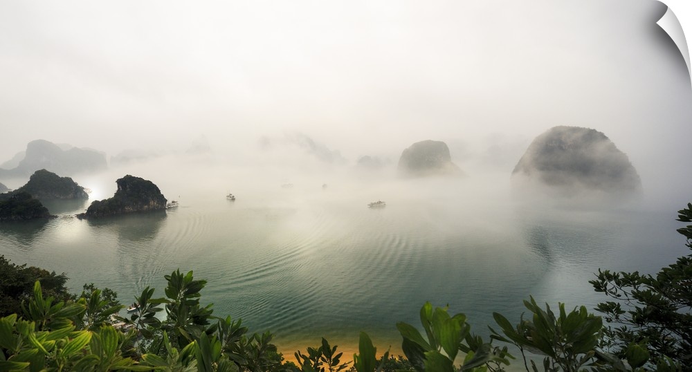 <p>Vietnam, Northeast, Halong Bay, Mist above waters of Halong Bay.</p>