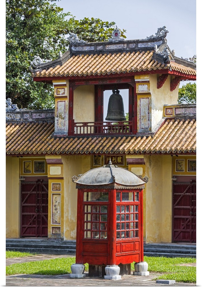 <p>Vietnam, Thura Thien-Hue Province, Hue. The bell tower of the Hiem Lam Pavilion and a classic red wood and glass telephone booth housing a bronze dragon. The Citadel, a World Heritage Site, was built between 1804 and 1833.</p>