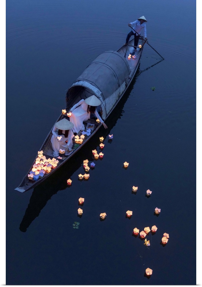 <p>Vietnamese girls in Ao Dai dresses drop floating candles on a river in Hue to pray for the dead, Hue, Thua Thien-Hue province, Vietnam.</p>