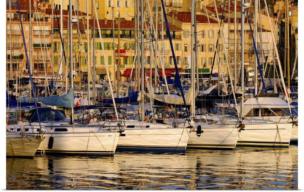 <p>The Vieux Port (old port) in the city of Cannes in the French riviera as the first rays of the morning sun illuminate the marina and the buildings.</p>