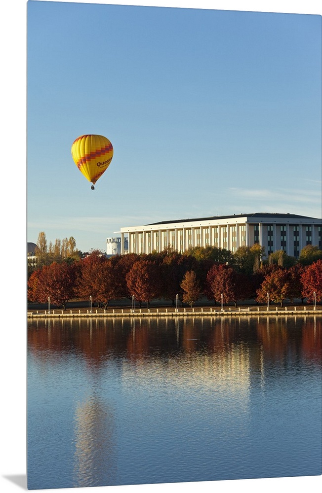 <p>Australia, Australian Capital Territory (ACT), Canberra. View across Lake Burley Griffin to hot air balloon and National Library of Australia.</p>