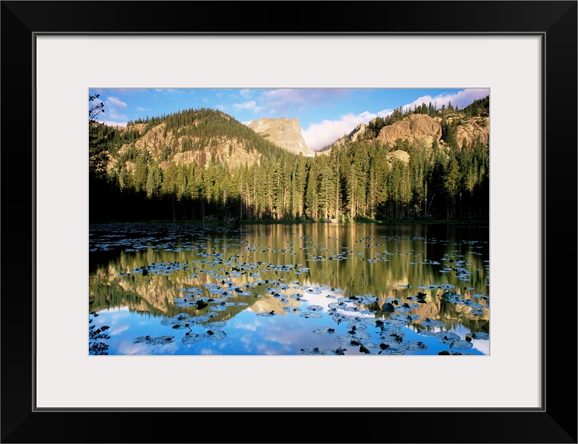 <p>View across Nymph Lake at sunrise, with Hallett Peak above the trees, Rocky Mountain National Park, Colorado</p>