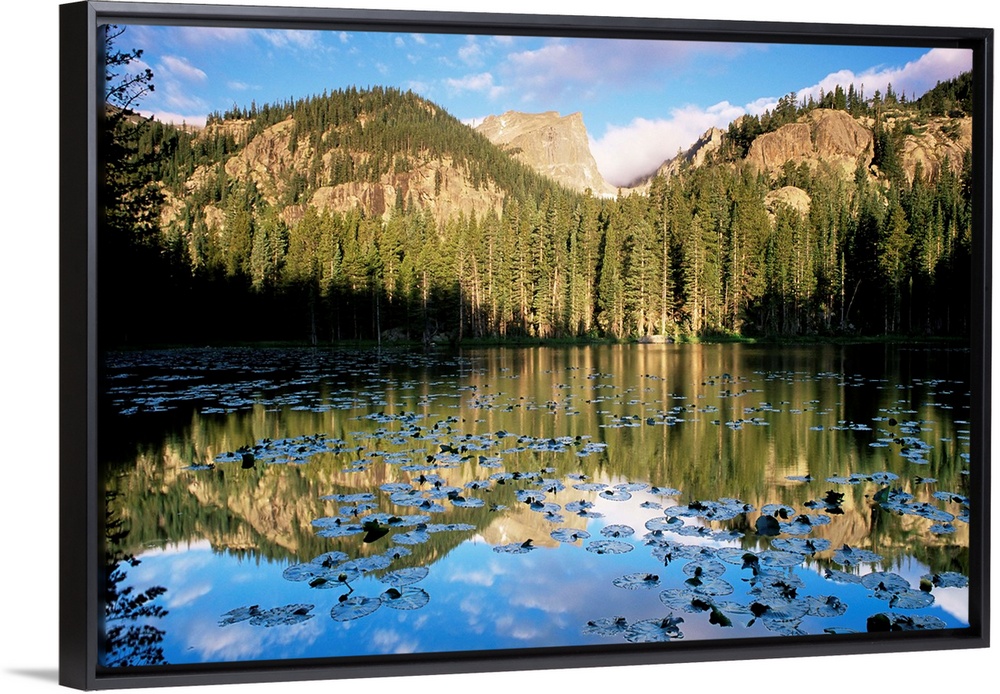 <p>View across Nymph Lake at sunrise, with Hallett Peak above the trees, Rocky Mountain National Park, Colorado</p>