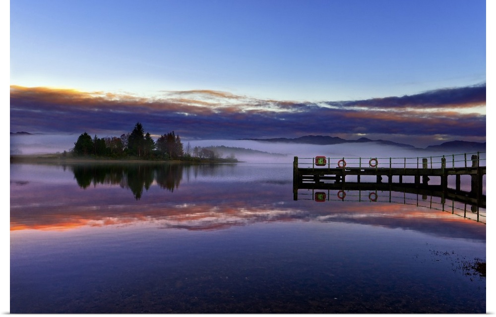 <p>A tranquil view across the calm waters of Loch Shiel as dawn breaks on a misty winter morning. Ardnamurchan, Scottish Highlands, Scotland</p>