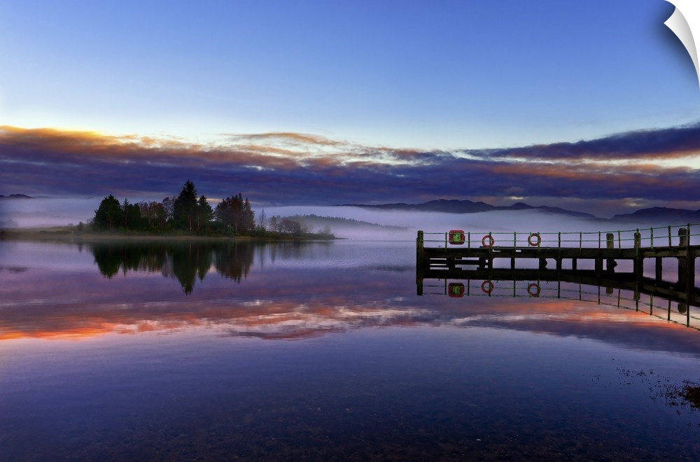 <p>A tranquil view across the calm waters of Loch Shiel as dawn breaks on a misty winter morning. Ardnamurchan, Scottish Highlands, Scotland</p>