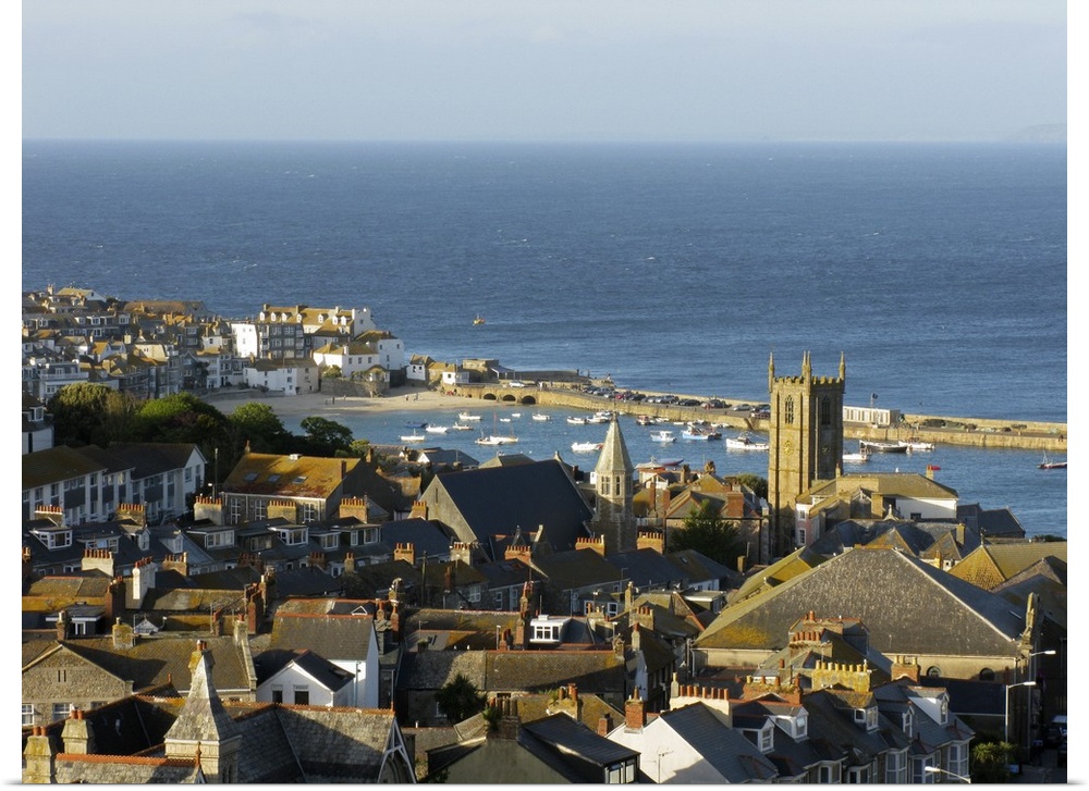 <p>England, Cornwall, St Ives. View across the town and harbour of St Ives and twards Godrevy Point across St Ives Bay.</p>