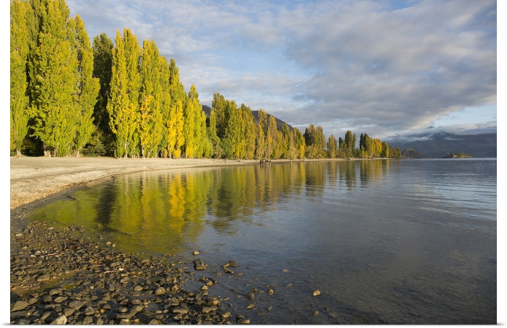<p>View along the shore of tranquil Lake Wanaka, autumn, Roys Bay, Wanaka, Queenstown-Lakes district, Otago, South Island, New Zealand, Pacific</p>