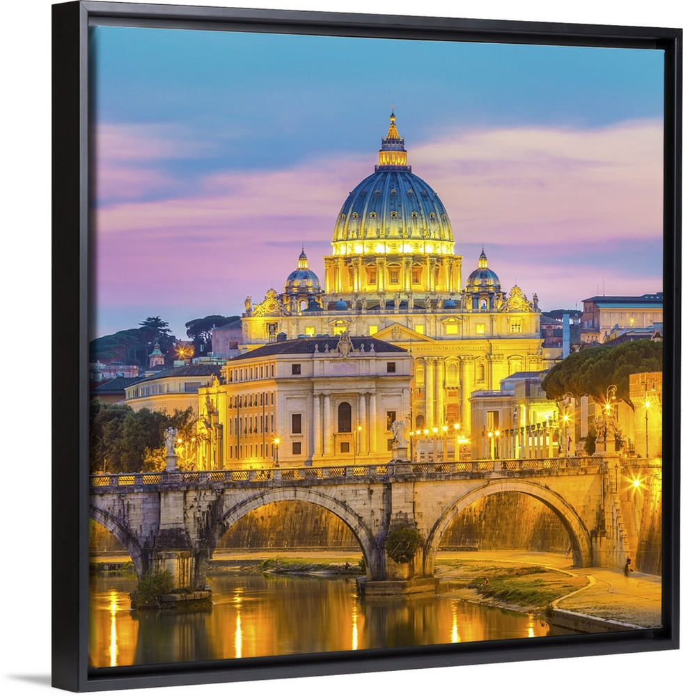 <p>Night view of old roman bridge of Hadrian and St. Peters cathedral in Vatican city Rome, Italy.</p>