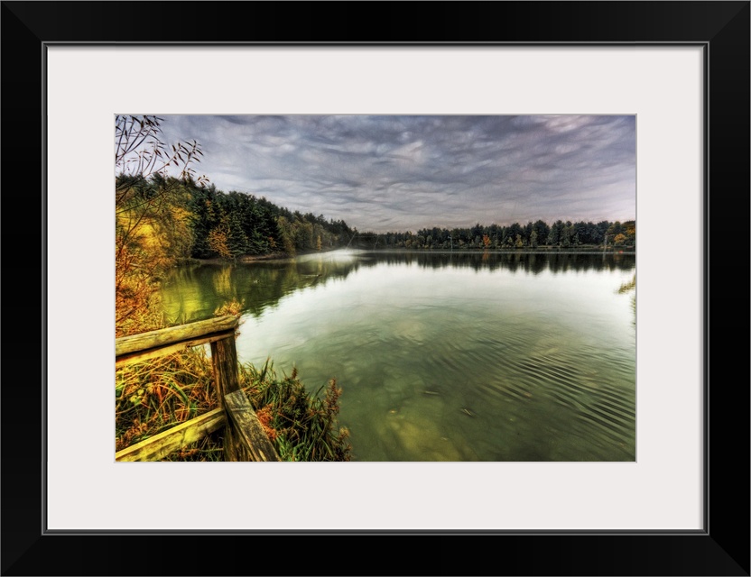 <p>View from a jetty across a misty foggy smooth boating lake with stormy dramatic skies and surroounded by trees</p>