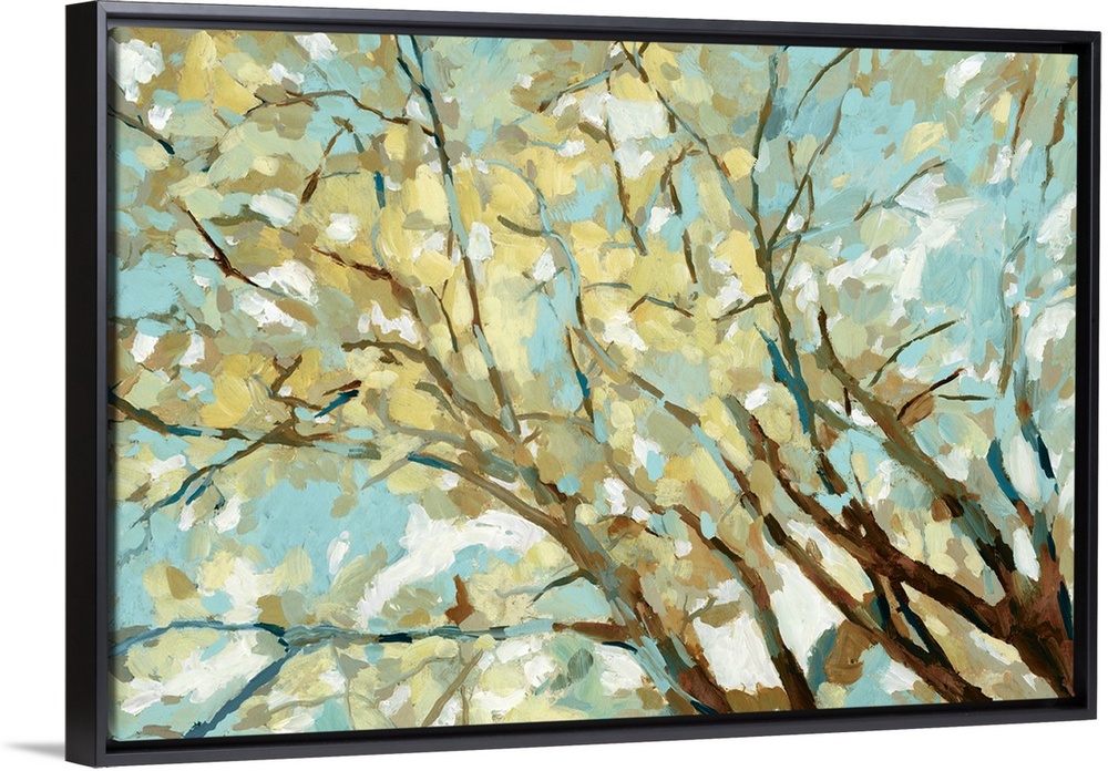 <p>Contemporary painting of branches with yellow and blue leaves.</p>