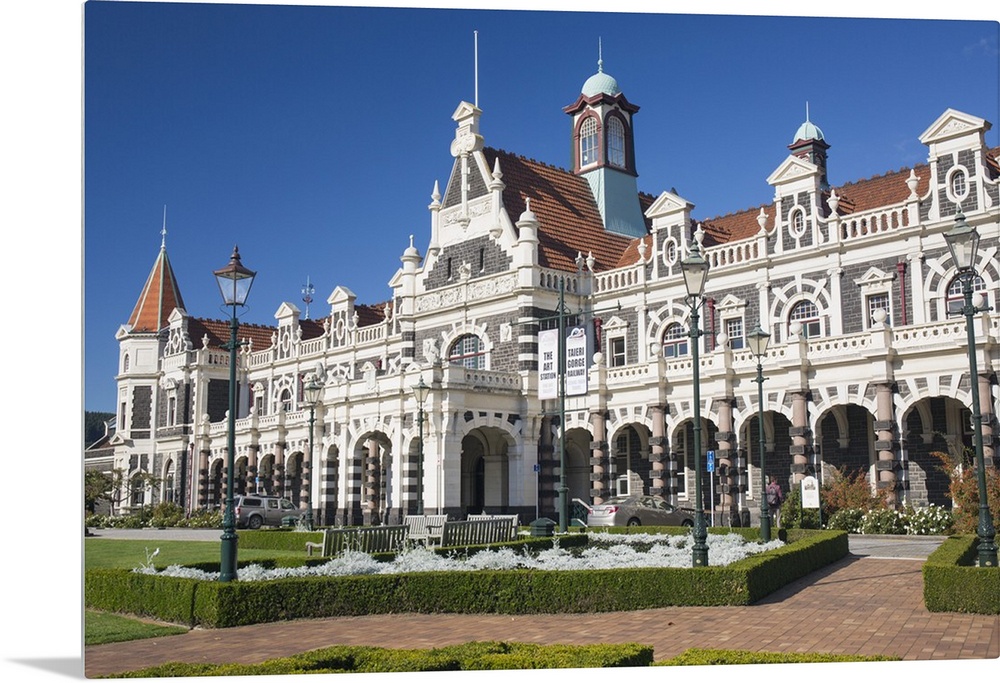 <p>View from gardens to the imposing facade of Dunedin Railway Station, Anzac Square, Dunedin, Otago, South Island, New Zealand, Pacific</p>