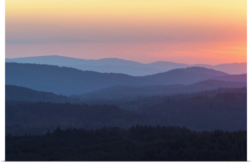 <p>View from Lusen mountain over the Bavarian Forest at sunset at Waldhauser in the Bavarian Forest National Park, Bavaria, Germany</p>