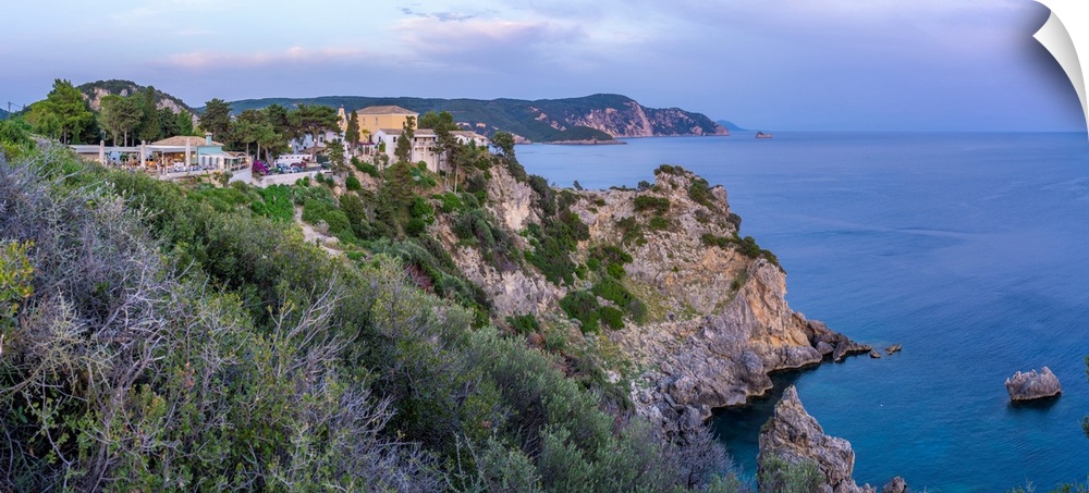 <p>View of coastline from Monastery of Paleokastritsa at sunset, Palaiokastritsa, Corfu, Ionian Sea, Greek Islands, Greece, Europe</p>