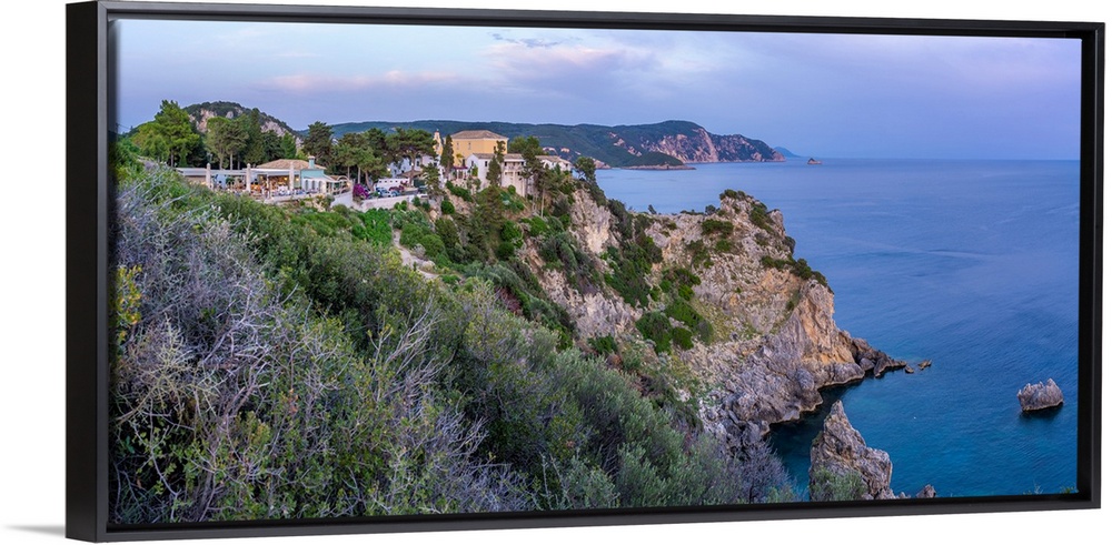 <p>View of coastline from Monastery of Paleokastritsa at sunset, Palaiokastritsa, Corfu, Ionian Sea, Greek Islands, Greece, Europe</p>