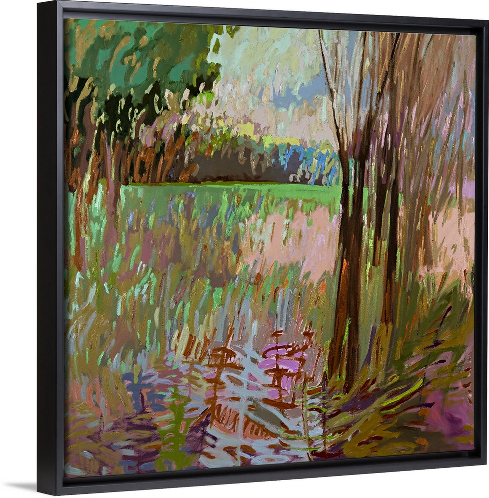 <p>Contemporary landscape painting of a field surrounded by trees.</p>