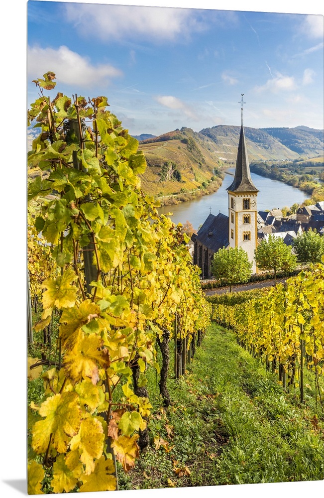 <p>View from the vineyards of the Calmont vineyard to the town of Bremm with the church of St. Laurentius and the Moselle loop, Bremm, Mosel, Rhineland-Palatinate, Germany</p>