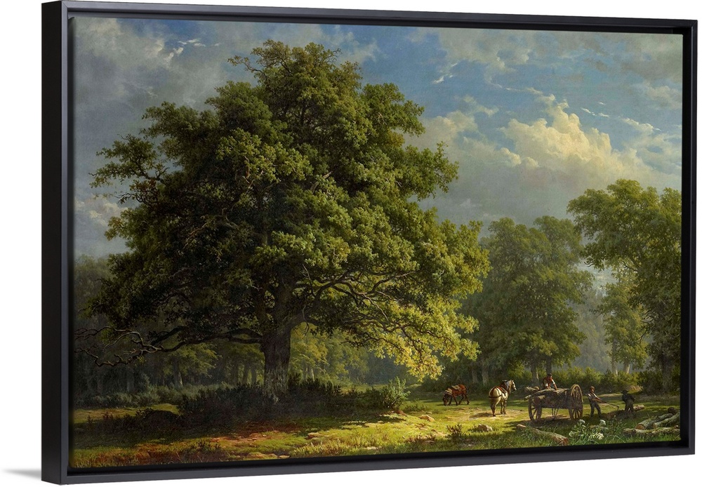 <p>View in the Bentheim Forest, by George Andries Roth, 1870, Dutch painting, oil on canvas. Bentheim Forest in eastern Netherlands with large oak and lumbermen loading tree trucks on a mallejan.</p>